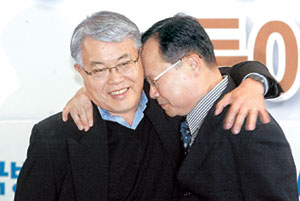 어깨동무 한 로버트김과 백동일 대령 - 6일 오후 5시 15분경 인천공항 입국장으로 들어선 김 씨는 꽃다발을 들고 마중 나온 백 씨를 보고 환하게 웃었다. 곧이어 백 씨가 김 씨의 어깨에 얼굴을 묻고 흐느끼자 김 씨는 백 씨를 다독였다. [사진 및 기사출처 : 동아일보]