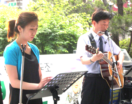 제일은행 본점(종로1가)앞에서 거리콘서트를 하는 최자영, 왕현모 회원