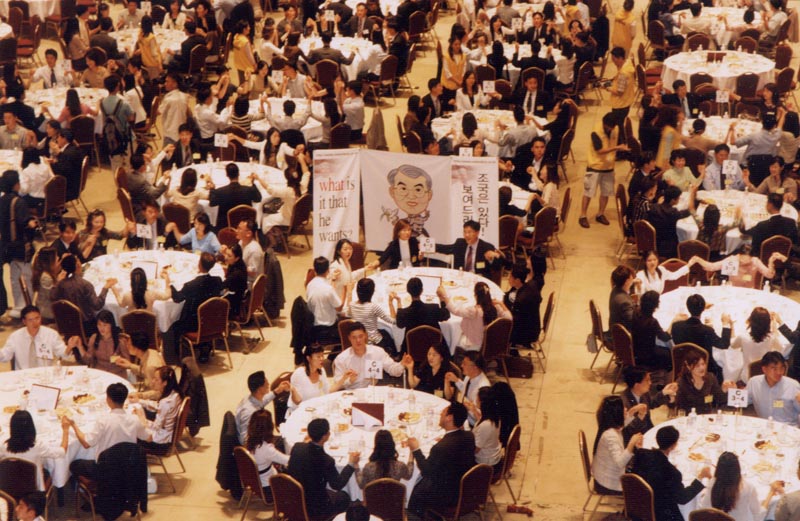 대규모 그룹 미팅에서 젊은남녀가 로버트김을 후원하며..