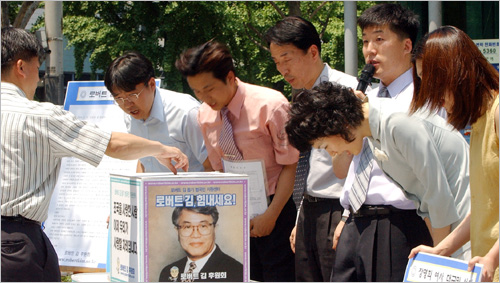 세종문화회관 분수광장, 후원회원들이 로버트 김 돕기 가두모금을 하고 있다.