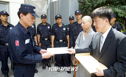 미대사관에 일시석방 탄원서를 전달하는 후원회장과 담용스님. (출처 : 6월 5일자 연합뉴스 보도)