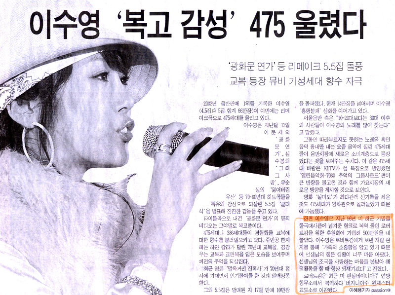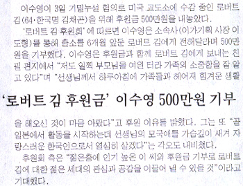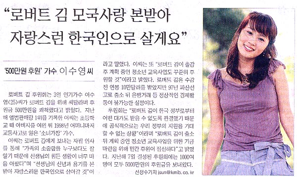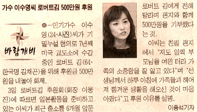 가수 이수영씨, 로버트김 500만원 후원