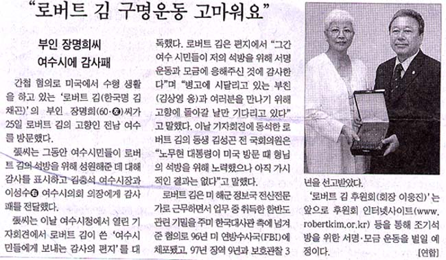 "로버트 김" 구명 힘쓰는 여수시에 감사패