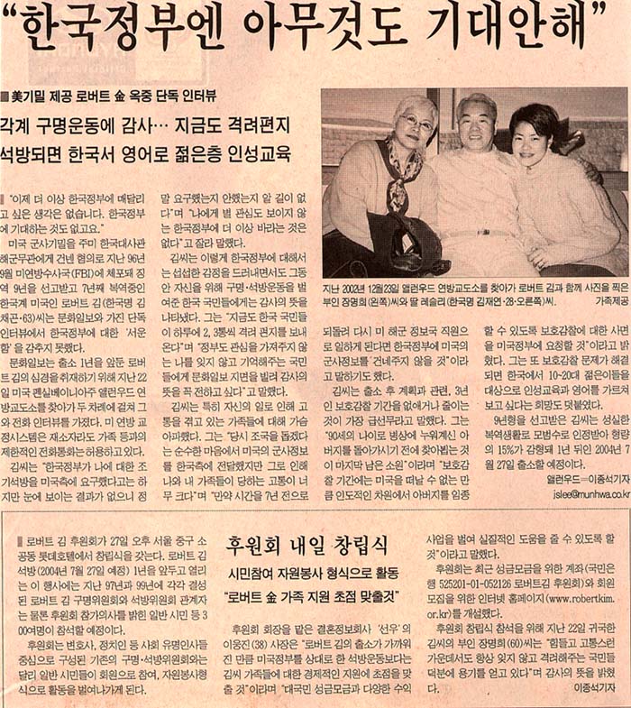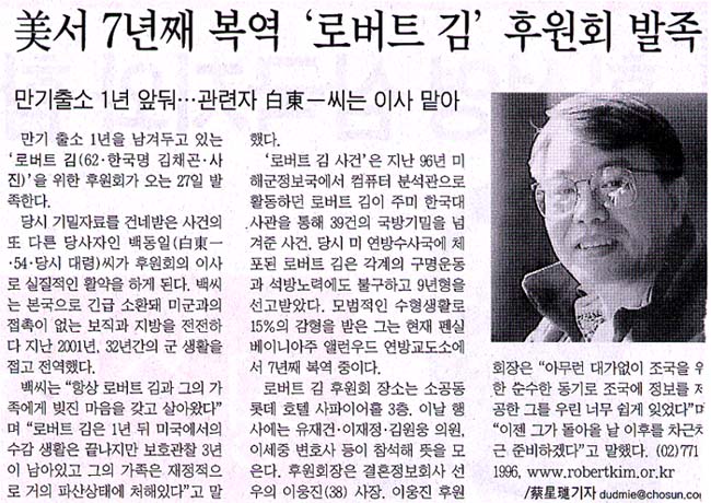 美서 8년째 복역 ‘로버트 김’후원회 발족