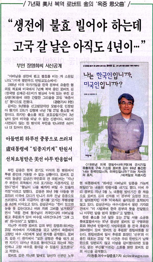 7년째 美서 복역, 로버트김의 옥중 思父曲